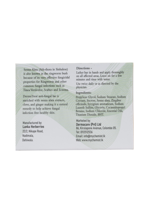 Derma Treat anti-fungal bar is enriched with senna alata extracts, love, and ginger making it a natural remedy to help achieve fungal infection free healthy skin.